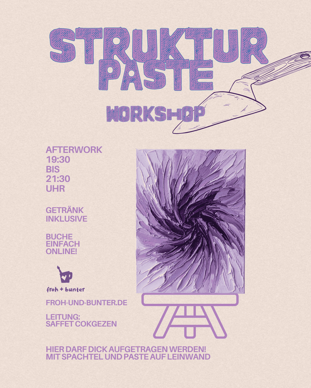Spachtel, Paste, Leinwand – wir bringen Relief in dein Bild! In diesem Workshop arbeiten wir nicht nur mit Farbe, sondern schaffen echte Dreidimensionalität. Hier werden Massen bewegt!