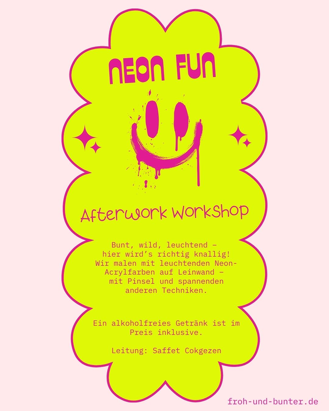 Wir malen mit leuchtenden Neon-Acrylfarben auf Leinwand – mit Pinsel und spannenden anderen Techniken. Dein eigenes Kunstwerk entsteht Schritt für Schritt unter Anleitung eines Künstlers, der dich inspiriert und unterstützt.