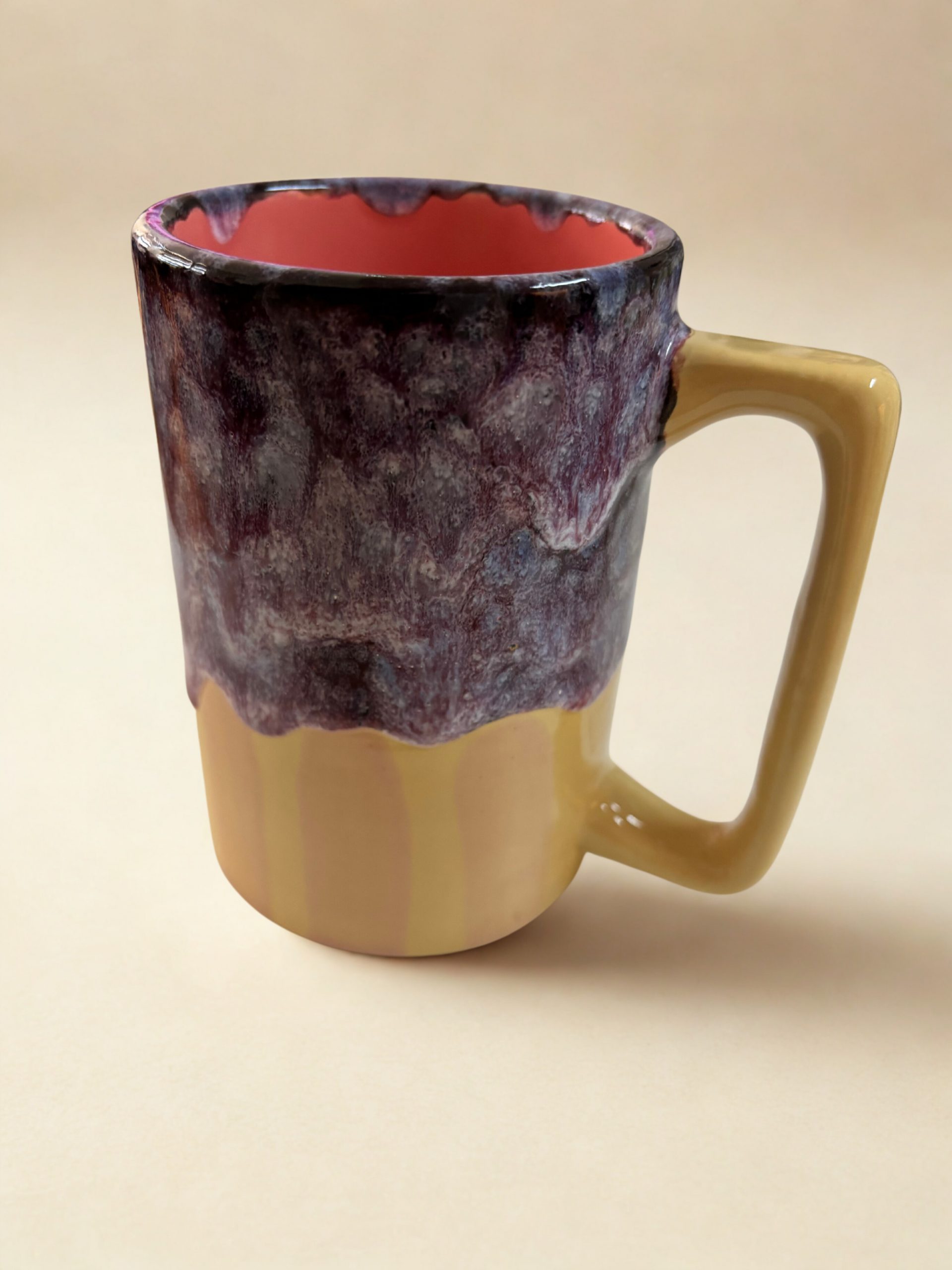 Diese außergewöhnliche Keramiktasse ist ein echtes Unikat und bringt stilvolle Handwerkskunst in deinen Alltag. Der obere Teil der Tasse ist mit einer faszinierenden Effektglasur in sattem Violett gestaltet, die wie ein sanfter Farbverlauf über den beigen Grundton fließt. Die glänzende Oberfläche verleiht der Tasse eine besondere Tiefe und macht jedes Stück zum Blickfang.
